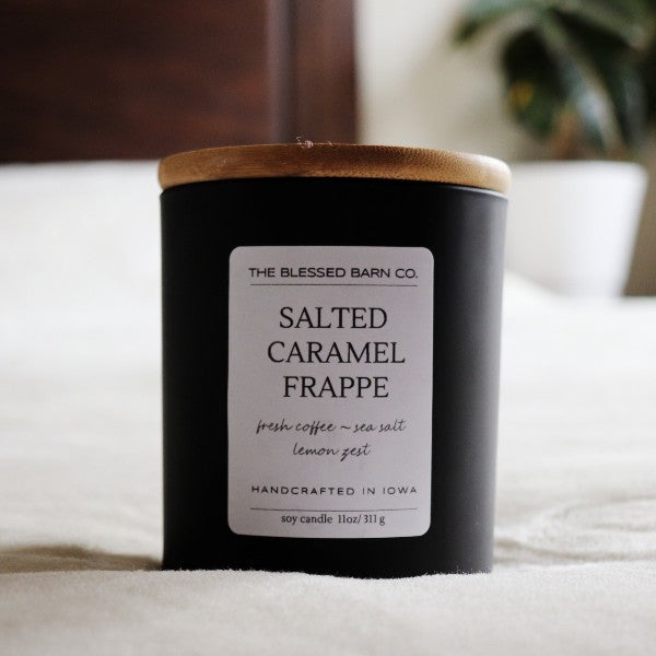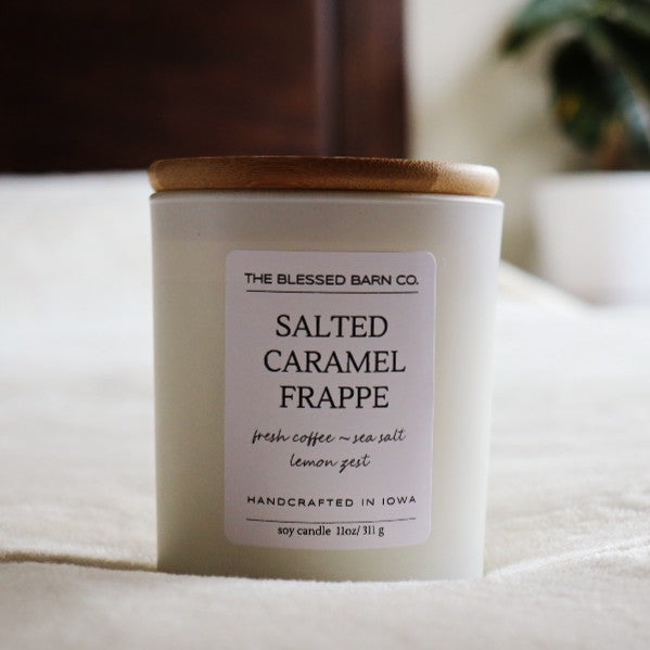 Experience the rich, complex flavor of our Salted Caramel Frappe candle. This exquisite blend of fragrance has coconut, freshly brewed coffee, lemon zest, and sea salt creating a unique, timeless flavor that will tantalize the senses and evoke a feeling of refined luxury.